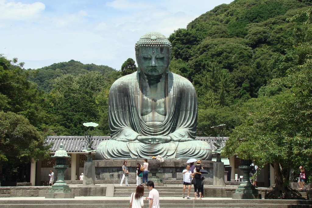 Le bouddhisme vient du mot ” Buddha” c’est quelqu’un qui a découvert la nature des choses telles qu’elles sont ( la vie, l’univers…) il a été le seul à comprendre le processus de la vie lui meme. Le bouddhisme avant tout un pratique qui a pour but la compréhension et en tout cas pas de croyance ! Avec les sanctuaires shinto , les temples bouddhistes sont les bâtiments les plus nombreux , les plus renommés et les plus reconnus au Japon ! le mot japonais du temple bouddhiste est tera . Un des plus fameux temples est Kotoku- in qui est un temple bouddhiste situé à Kamakura dans la préfecture de Kanagawa au Japon . Le temple est connu par le statue de Grand Bouddha, une statue en bronze d’Amitabha Bouddha qui est une des plus célèbres icônes au japon ! Il abrite un grand nombre de visiteurs , environ deux millions de visiteurs par an et 10% d’étrangers ! Cette statue date 1252 de l’époque de Kamakura; cette statue est caractérisée par le faite qu’elle pèse 121 tonnes et avec une longueur de 13.35 mètres ! Avant la construction de cette statue bouddha , il y avait une autre statue de bouddha en bois , mais elle a été détruit à cause d’une tempête en 1248 et ils ont décidé de construire un autre Buddha en bronze !